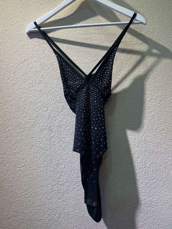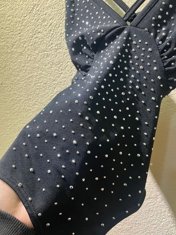 El Body Orion captura la esencia de la noche estrellada. Con un diseño drapeado profundo en el escote, breteles finos cruzados y cubierto de mini cristales.